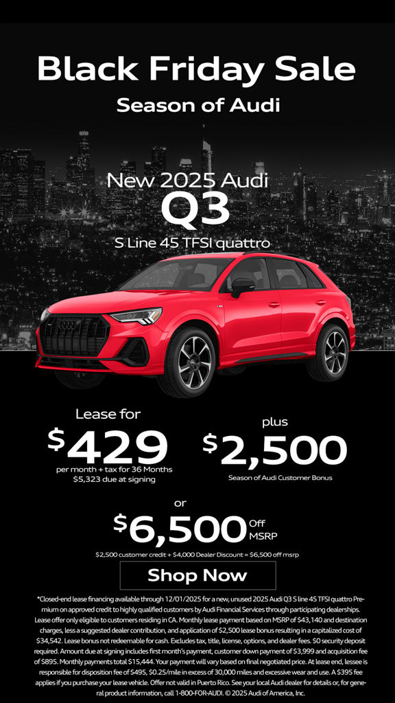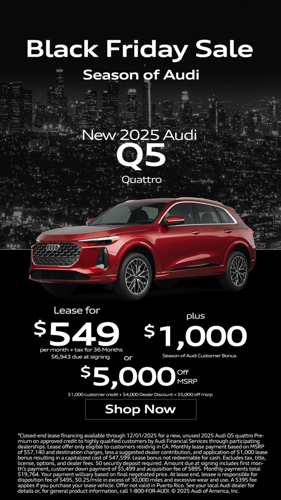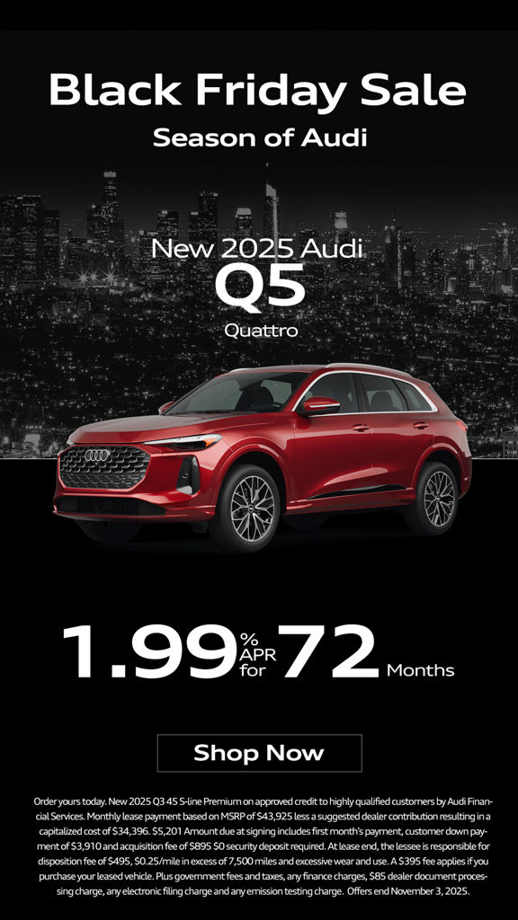 Audi Downtown LA makes owning or leasing a new or used Audi car or SUV easier than ever with our model specials, Audi factory incentives, featured new vehicle specials, and featured pre-owned specials. If you want to save big on a new or used Audi A4, A5, e-tron, Q3, Q5 or SQ5, Q7, or Q8, Audi Downtown LA is ready to deal. We'll help make driving your dream car a reality with our exceptional money-saving offers, whether it's a used luxury vehicle from another brand or a late-model used electric car. Shoppers in the Monterey Park area should look over our selection to choose the luxury car they're most excited about. Then contact us to see how we can help you save!